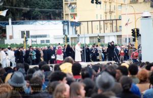 Il 27 aprile 1991 viene ricordata come una data storica per la città di Matera e per i materani. Il motivo che rese indimenticabile questo piovoso sabato primaverile fu la visita di Papa Giovanni Paolo II (Papa Wojtyla) nella Città dei Sassi (il ritorno di un Papa a Matera dopo la permanenza di qualche mese di Papa Urbano II nell’ottobre del 1093). Nonostante le avverse condizioni metereologiche, una gran folla assiepata lungo tutto il tragitto attese con impazienza la vettura con a bordo il Santo Padre. Il Pontefice, dopo essere atterrato sul belvedere di Murgia Timone, si diresse nei Sassi ed in Cattedrale, successivamente in piazza della Visitazione (ribattezzata proprio in questa occasione) per il tradizionale saluto, successivamente presso la Casa di Riposo “Brancaccio” per il pranzo ed il riposo. Tra la moltitudine di persone si faceva largo Enzo Scasciamacchia con la sua macchina fotografica. Ecco a voi i bellissimi scatti che testimoniano le emozioni vissute da Enzo e da tutti i cittadini accorsi festanti.