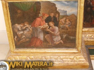 Il salone raccoglie al suo interno ben 34 vedute prospettiche di città e paesi limitrofi, queste rappresentano delle vere e proprie fotografie d’epoca, delle splendide testimonianze dall’alto valore storico. Oltre alle vedute di Matera ed Acerenza (sui lati minori della sala), le città sedi delle chiese cattedrali, vi sono 6 città sedi dei vescovi suffraganei (sui lati maggiori ed al sommo: Altamura, Gravina, Anglona-Tursi, Tricarico, Venosa e Potenza) e 28 centri abitati facenti parte dell’arcidiocesi (sui quattro lati, rispettando le distanze geografiche dalle sedi cattedrali). Per la realizzazione delle vedute prospettiche gli studiosi ipotizzano un coinvolgimento di Francesco Cassiano de Silva, autore nello stesso periodo storico di incisioni ed acquerelli dello stesso tipo di città e paesi del Regno di Napoli. Sulla volta sono presenti anche le immagini dei Santi Patroni: la Vergine Maria con Bambino, Sant’Eustachio (foto a sinistra) e San Canio.