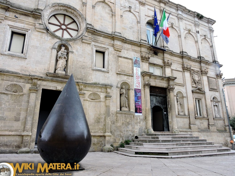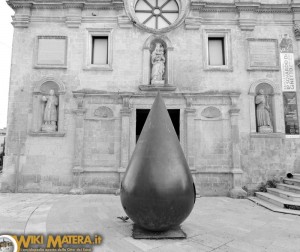 “La Goccia di Azuma” è un monumento che si trova a Matera, precisamente in piazzetta Pascoli, realizzato dal famosissimo scultore e pittore giapponese, artista contemporaneo, Kenjiro Azuma (italianizzato in Kengiro Azuma), nato a Yamagata il 12 marzo 1926 e morto a Milano il 15 ottobre 2016. Il monumento, che rappresenta una vera e propria goccia in bronzo alta oltre tre metri, è collocato di fronte il Museo di Arte Mediovale e Moderna della Basilicata, ospitato nel Palazzo Lanfranchi; siamo nel cuore della città e nel pieno del passeggio principale che parte da piazza Vittorio Veneto e si spinge fino in via Ridola, in cui sorge l’omonimo Museo Archeologico Nazionale “Domenico Ridola”. Un luogo ricco di vita e di energia, quindi, in cui “La Goccia” può essere apprezzata sia dai materani sia dai numerosi flussi turistici che affollano questo crocevia per accedere ai musei, per entrare nei rioni Sassi o, semplicemente, per godere del magnifico panorama che si può ammirare dal belvedere, posto a sinistra del Palazzo Lanfranchi (guardando la facciata).