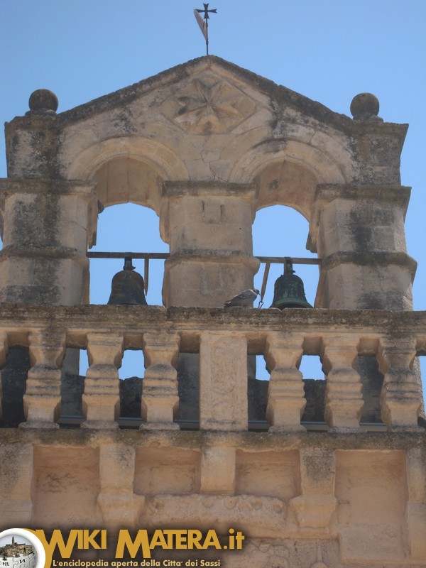 Un altro elemento importantissimo che caratterizza l’aspetto esterno della chiesa è il campanile a torre piatta che presenta, al centro, gli stemmi dei Cavalieri di Malta e della famiglia Zurla. La presenza dei Cavalieri di Malta a Matera attesta come i templari si siano insediati nel territorio materano e nell’intera Basilicata tra l’XI ed il XIII secolo.